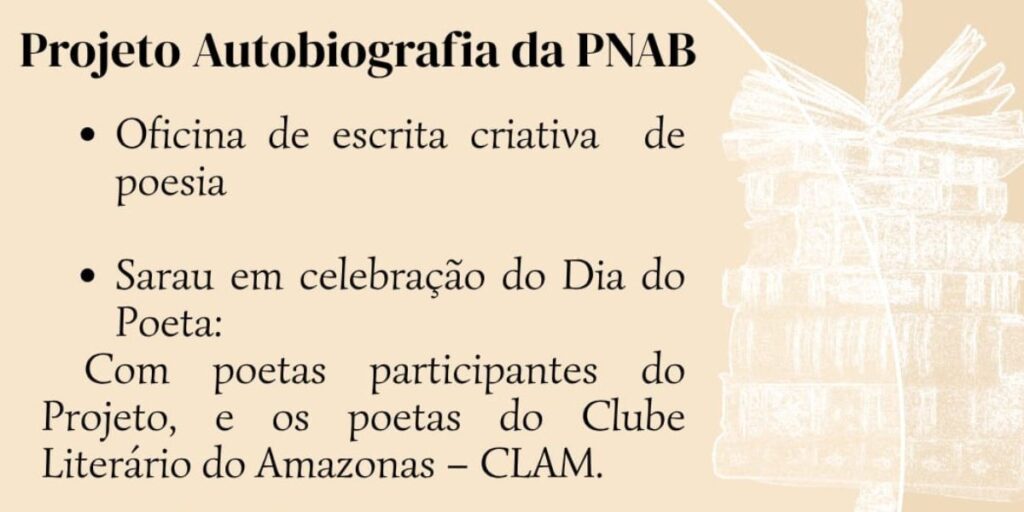 A ocasião também conta com a participação dos poetas participantes do “Projeto Autobiografia”, livro desenvolvido por 20 jovens escritores. O projeto foi contemplado pela Política Nacional de Aldir Blanco (PNAB) e proporcionou diversas oficinas e encontros ao longo deste ano.