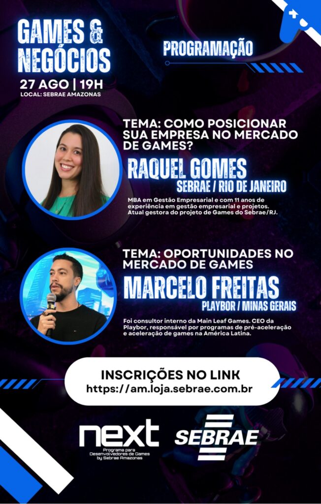 “Nosso objetivo é mostrar que os games não são apenas diversão, mas também um setor estratégico para geração de negócios, renda e inovação. O seminário faz parte da trilha do Next Sebrae, que está formando empreendedores preparados para competir em escala nacional e internacional. Quem participa de encontros como este sai com uma visão prática do mercado e mais conectado ao ecossistema de inovação do Amazonas”, destacou.