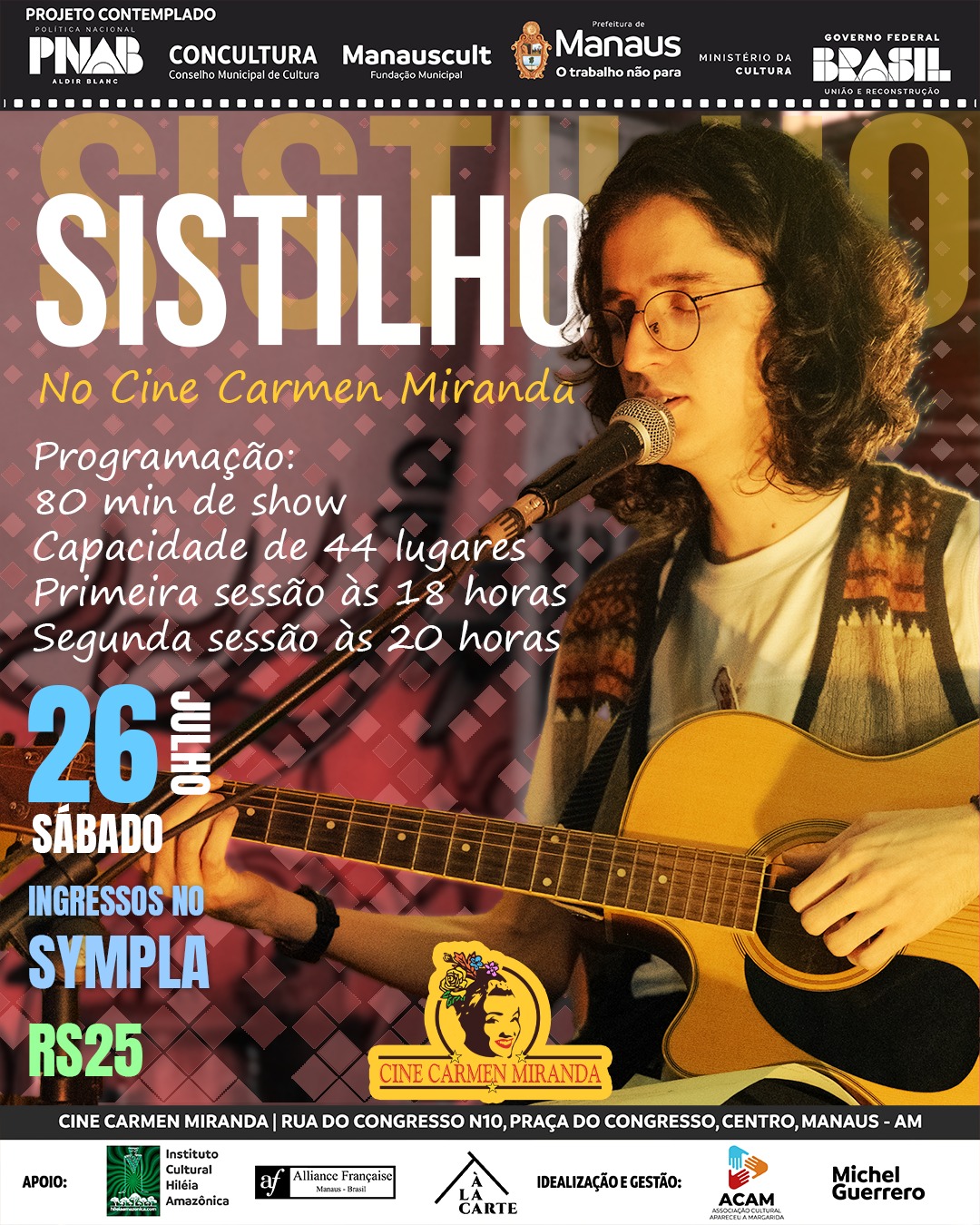 No sábado, 26, o cinema terá uma atração musical com o show “Sistilho”, do jovem cantor Lucas Sestilho, em duas sessões, às 18h e 20h, com ingressos a R$ 25, através do site Sympla.