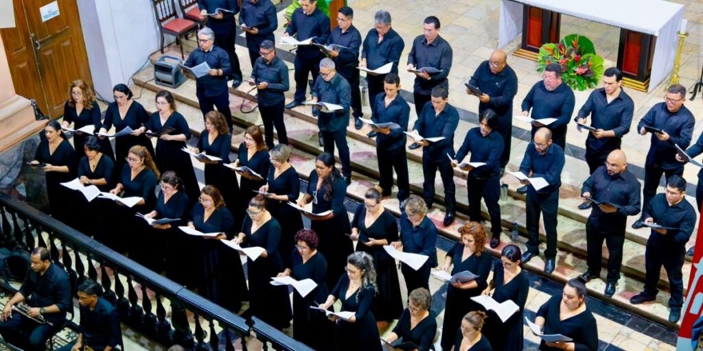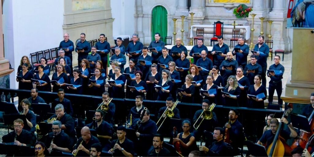 A apresentação reúne o Coral do Amazonas e a Amazonas Filarmônica, sob regência do maestro Otávio Simões.