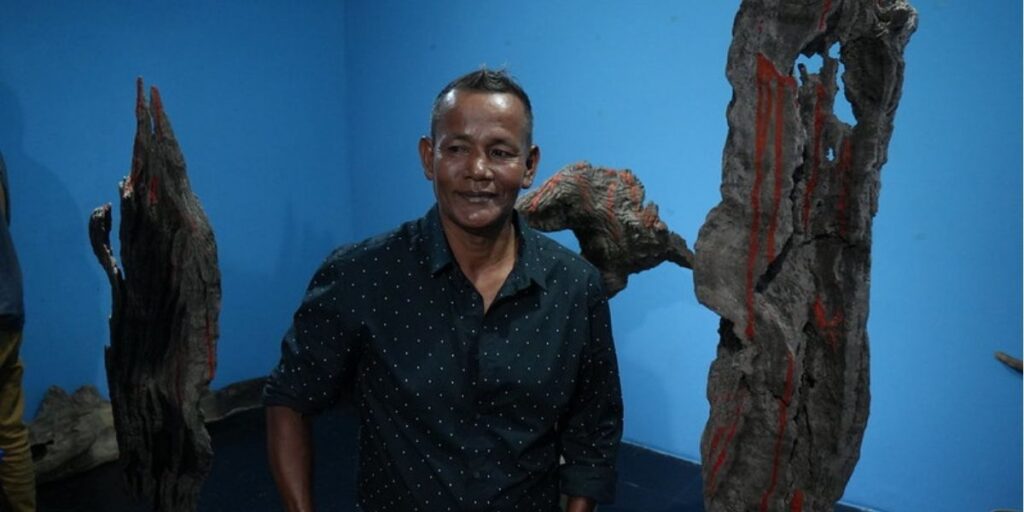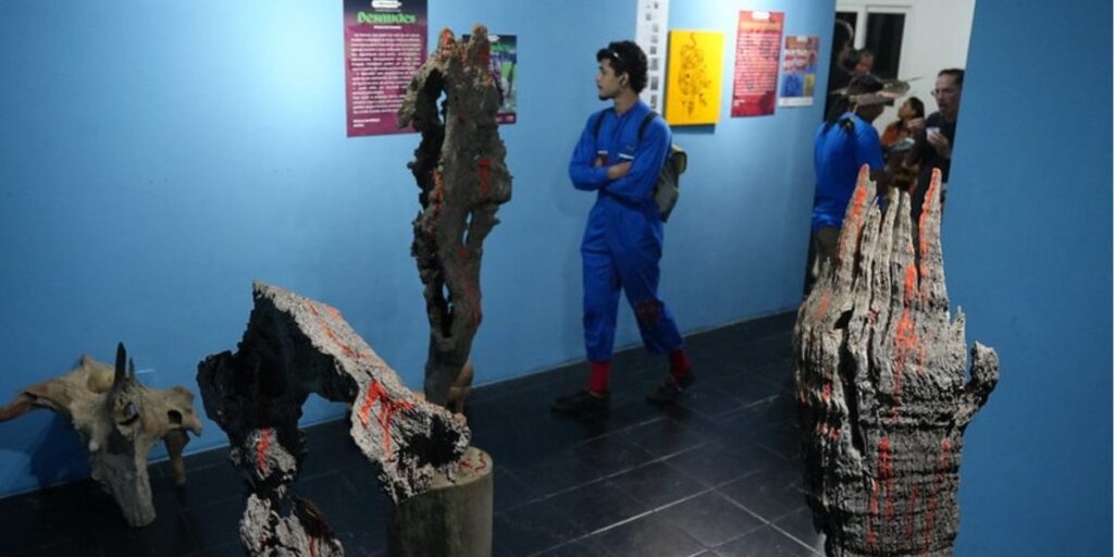 Na instalação “Desnudes”, Paulo Olivença utiliza elementos da florestas como troncos, raízes e vídeos para abordar as tensões entre o meio ambiente e a ação humana. O objetivo é provocar o público a refletir sobre as suas contribuições, a relação com os impactos ambientais e a urgência da preservação da Amazônia.