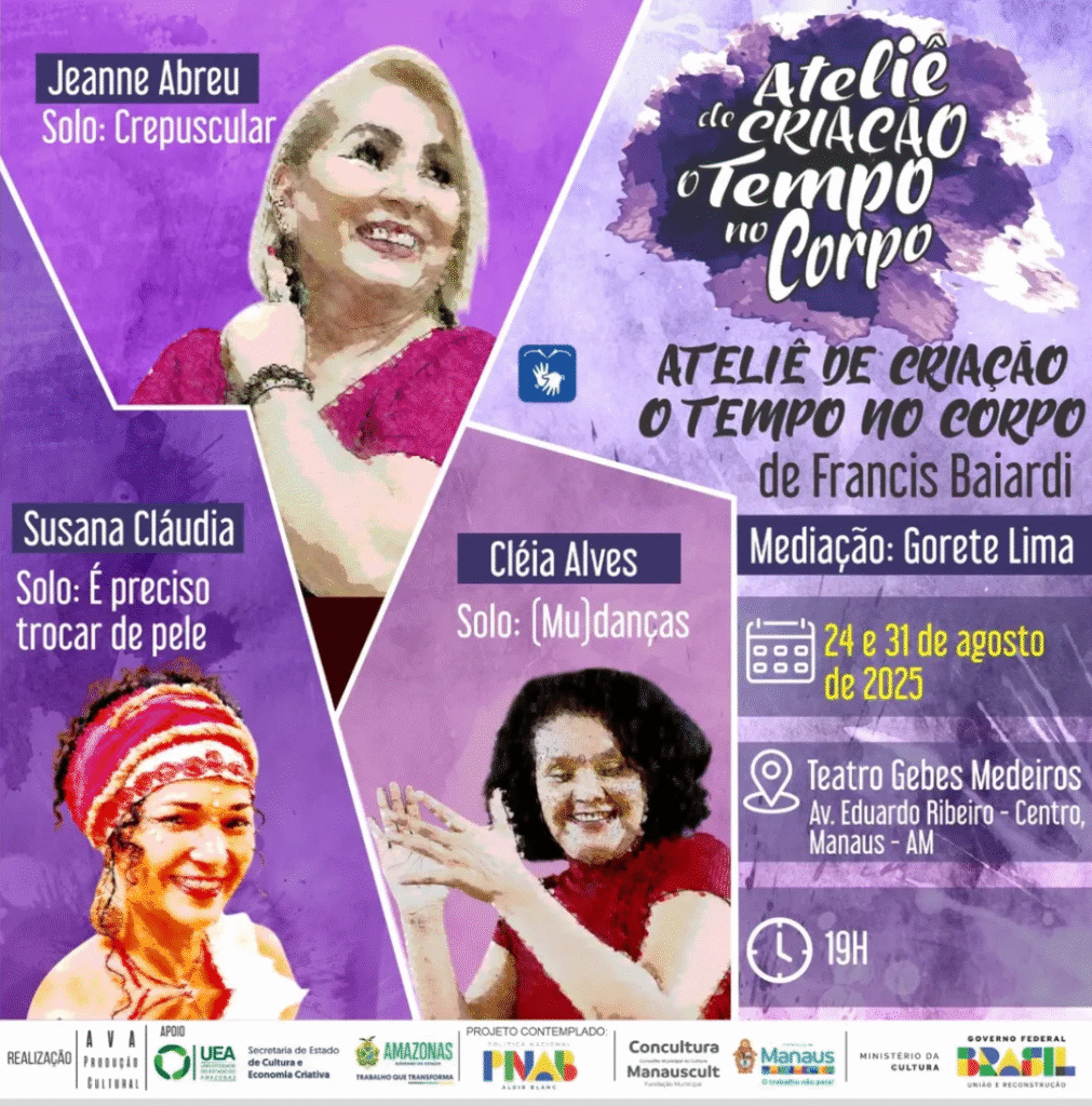 Três criações autorais são apresentadas no evento, propondo reflexões sobre envelhecimento, transformação e continuidade. São elas, “Crepuscular” de Jeanne Abreu, uma narrativa em dança que apresenta o limiar entre a velhice e a partida; “É preciso trocar de pele” de Susana Cláudia, com a apresentação que reverbera danças com suas memórias, saudades e imersão do eu; e “(Mu)danças” de Cléia Alves, que destaca o passar do tempo, com seu florescimento e ensinamentos.