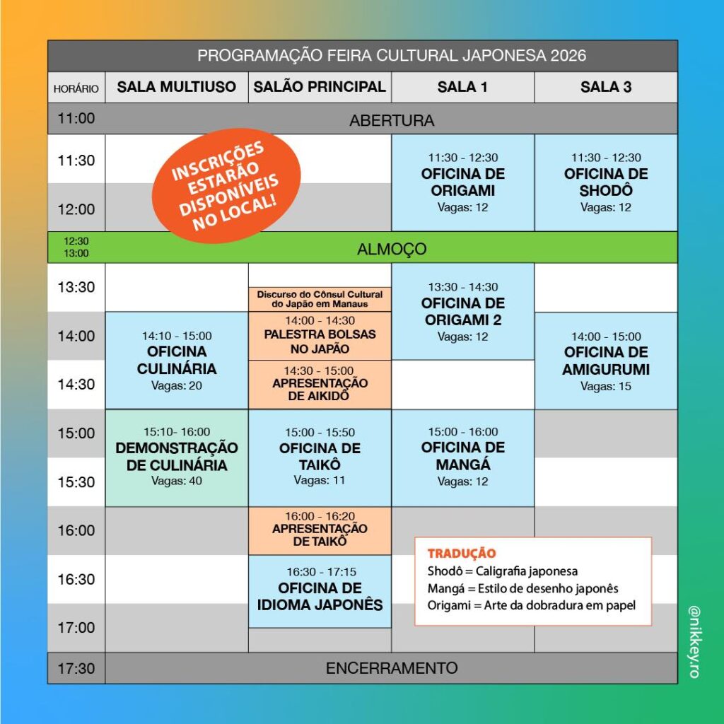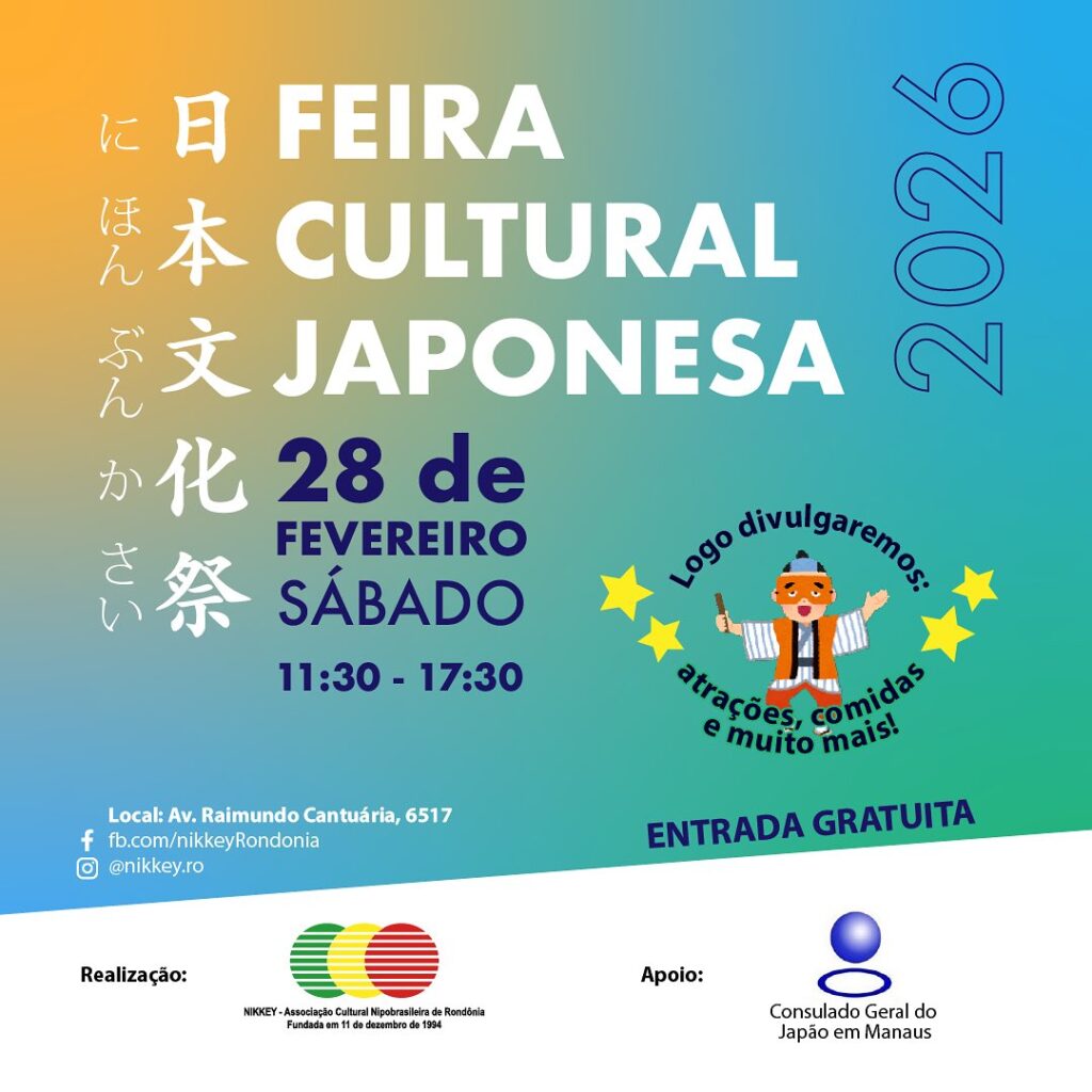 A Feira Cultural Japonesa 2026 acontece neste sábado (28), de 11h30 às 17h30, na sede da Associação Nikkey RO, em Porto Velho, com programação gratuita organizada pela Associação Cultural Nipo-Brasileira de Rondônia. O evento apresenta atividades ligadas à cultura japonesa, incluindo oficinas, exposições e estandes temáticos ao longo do dia.