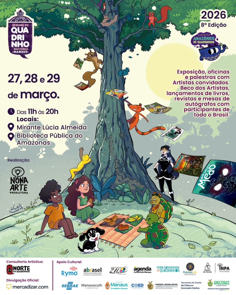 A Semana do Quadrinho Nacional de Manaus (SQNMao) está confirmada para acontecer entre os dias 27 e 29 de março no Mirante Lúcia Almeida e na Biblioteca Pública do Amazonas. A programação é gratuita e inclui novidades como a participação de mais de 70 artistas de 15 estados e o Distrito Federal, o uso do Passaporte oficial do evento para imersão cultural, e muito mais.