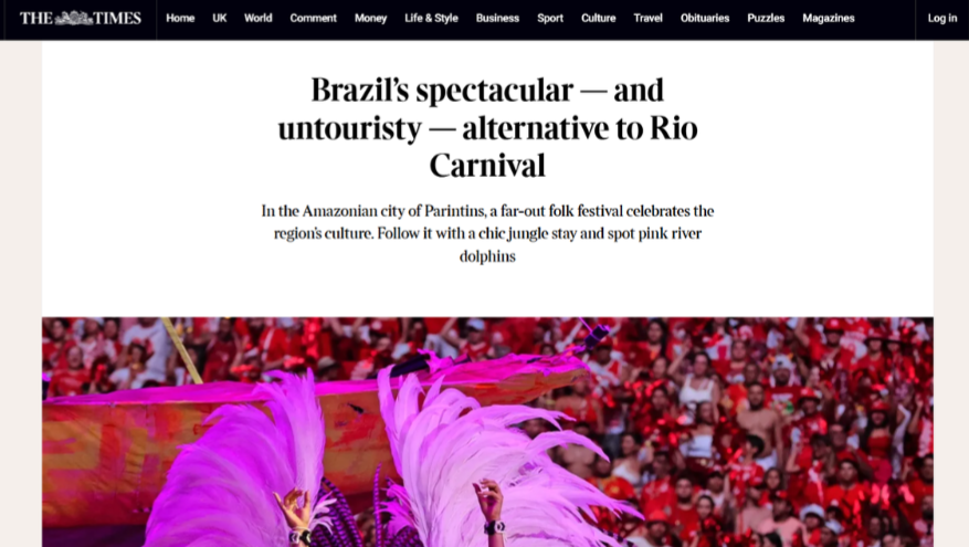 O Festival de Parintins foi tema de uma reportagem do jornal britânico The Times, publicada na segunda-feira (9), que descreve a festa amazonense como uma alternativa ao Carnaval do Rio e destaca a riqueza cultural e natural da região.