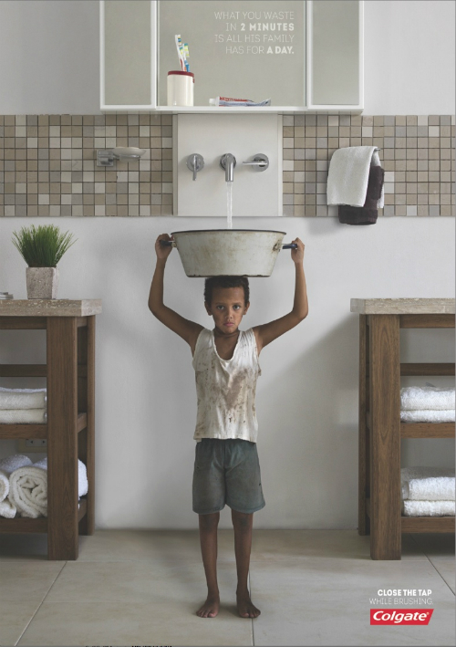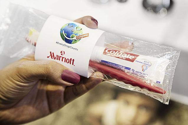 Com o objetivo de engajar a população brasileira contra o desperdício, em 2016, a marca de creme dental Colgate, em parceria com a rede de hotéis Marriott, colocou adesivos no fundo das pias de todos os quartos e das áreas públicas dos hotéis da rede, em São Paulo e em Recife.