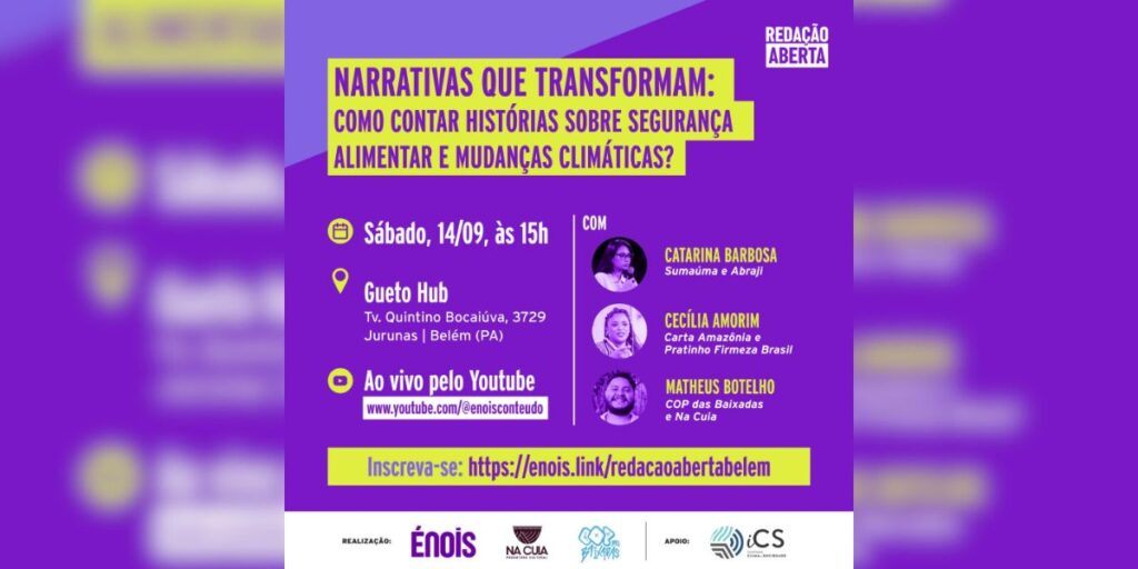 A Énois Laboratório de Jornalismo, em parceria com a Na Cuia e a COP das Baixadas, anuncia o evento “Redação Aberta: Narrativas que transformam – Como contar histórias sobre segurança alimentar e mudanças climáticas”, que ocorrerá no dia 14 de setembro a partir das 15h no Gueto Hub, em Belém do Pará, com transmissão ao […]